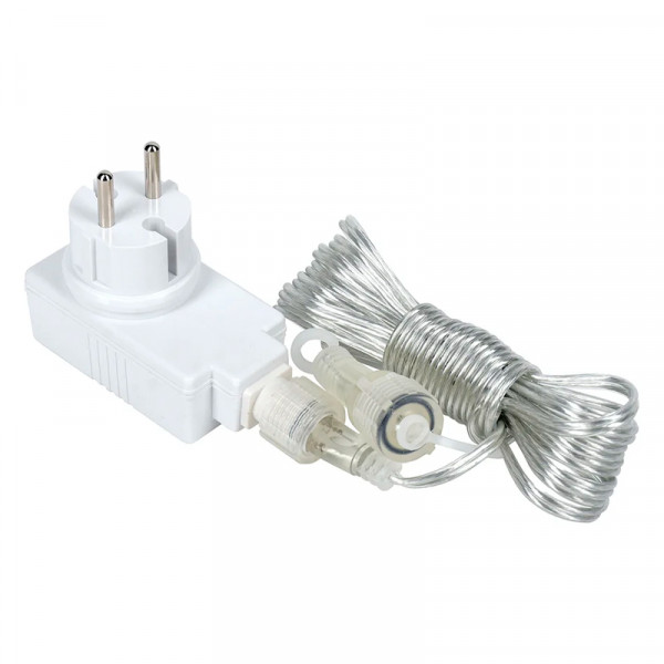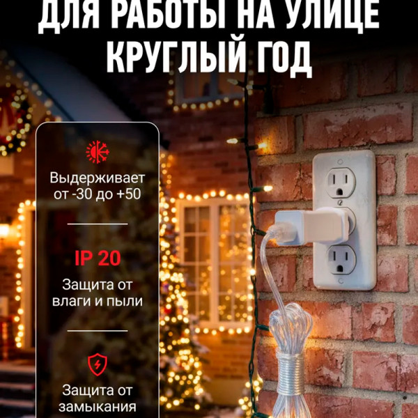 Дополнительная информация: Мощность 12 W. Цвет провода прозрачный. Длина провода 300 см. Имеет таймер, 6 часов гирлянды светят, 18 часов гирлянды выключены. Степень защиты IP44. Температурный режим от -30 до +50, и относительной влажностью 80%.